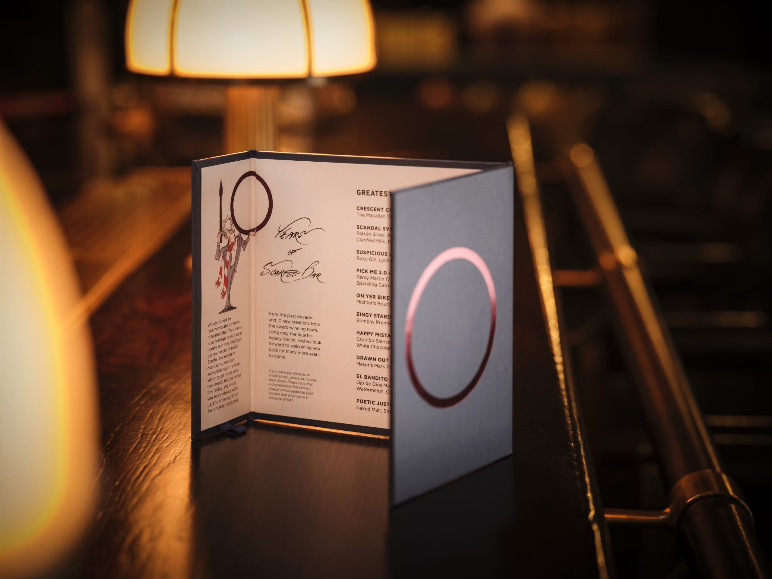 Depuis plusieurs années maintenant, l’équipe s’amuse à nous surprendre en travaillant des concepts assez novateurs comme l’Enneagram menu (2020) qui permettait aux guests de répondre à 10 questions pour connaitre leur type de personnalité en flashant un QR code pour commander le cocktail associé. Le Purple Book (2018) et le Off the Wall menu (2021) s’inspiraient quant à eux des caricatures de personnalités britanniques de Gerald Scarfe et leur donnaient vie en utilisant des filtres sur Instagram qui permettaient aux guests de s’immerger dans cette ambiance satirique. Le Music Menu (2019) avait également fait beaucoup parlé de lui de par son inventivité et l’album de reprises en version jazz enregistré par le groupe de musique qui joue 3 soirs par semaine au bar depuis son ouverture (vous pouvez l’écouter sur les sites de streaming, Scarfes album).