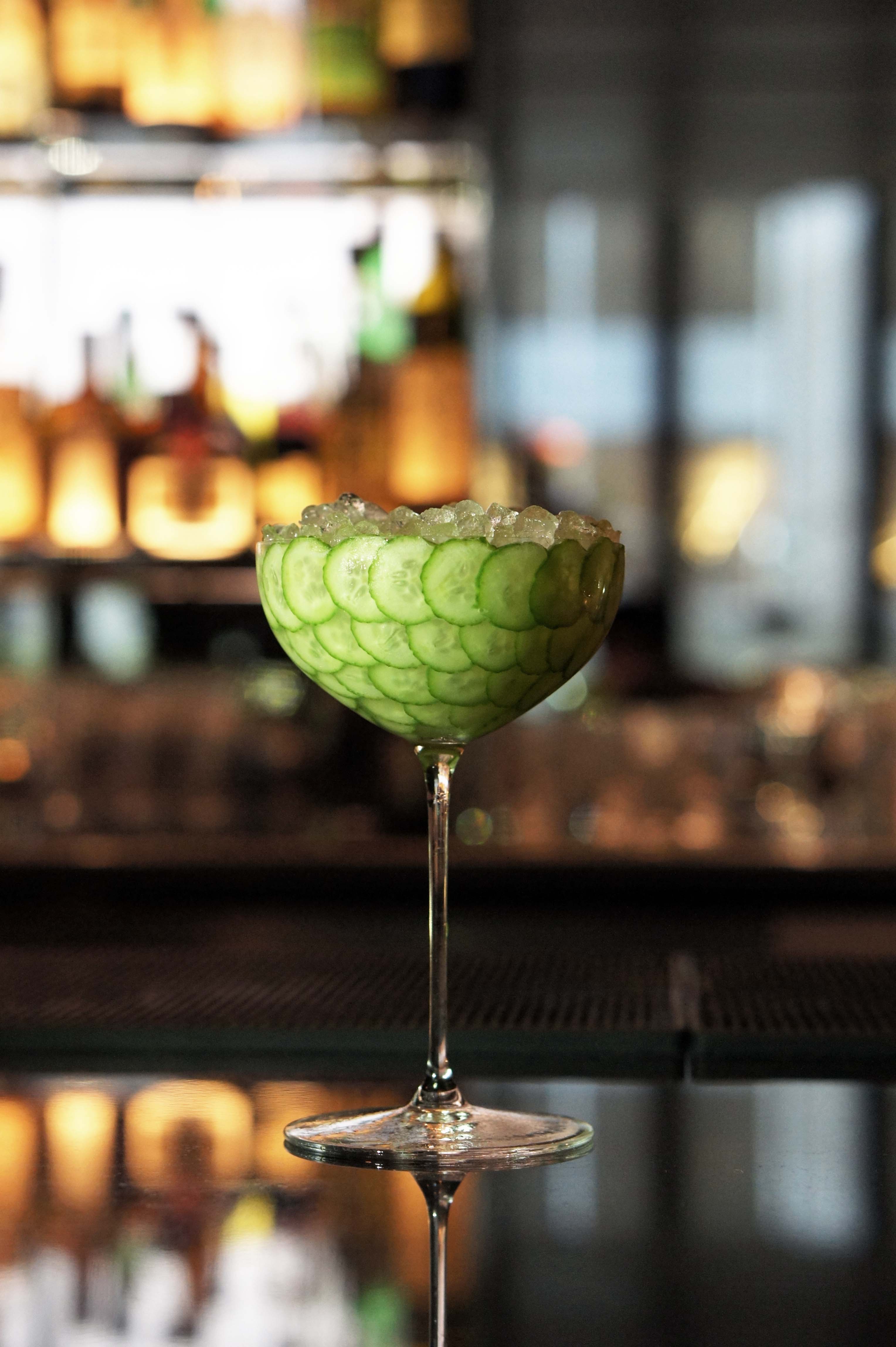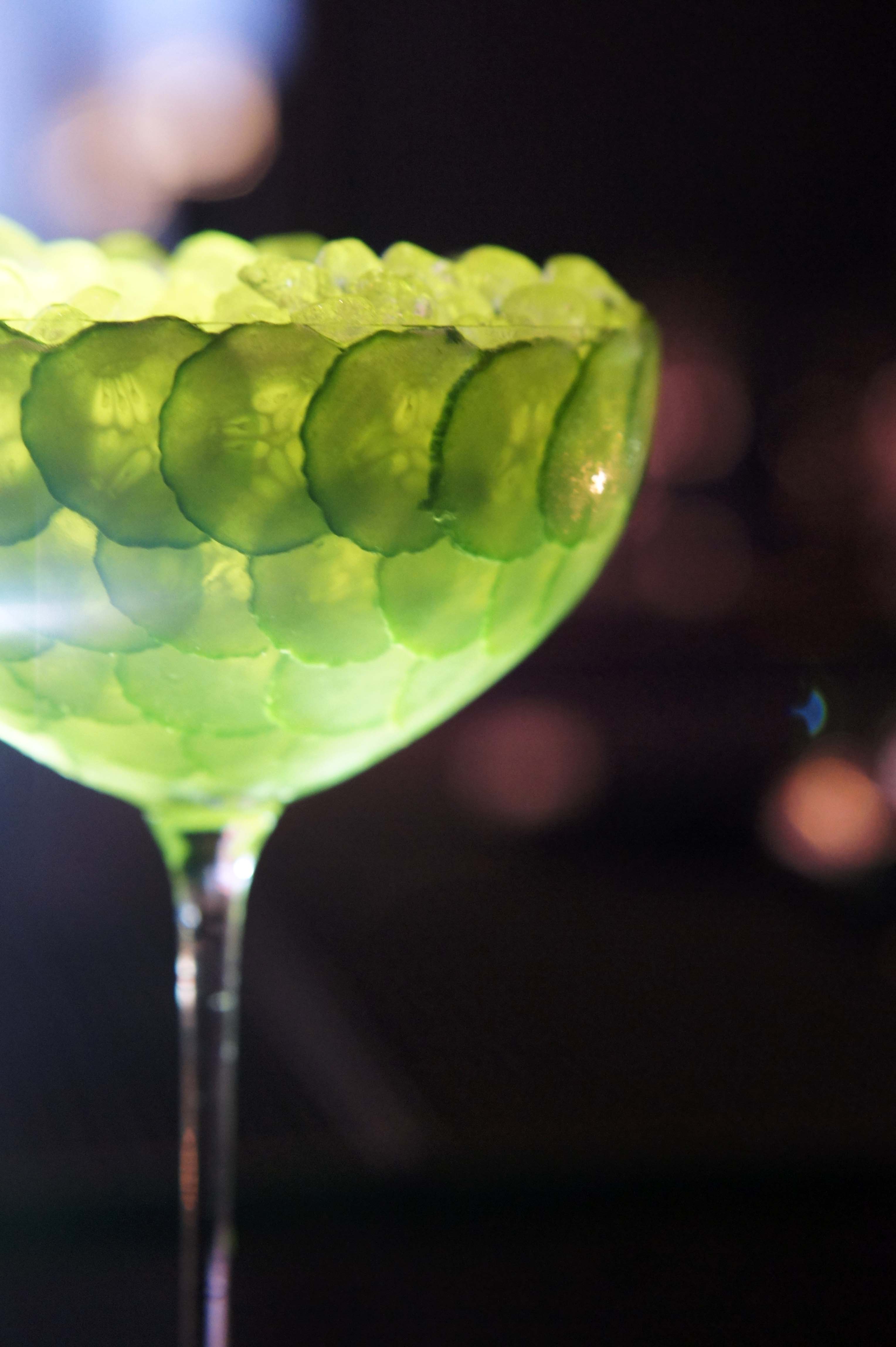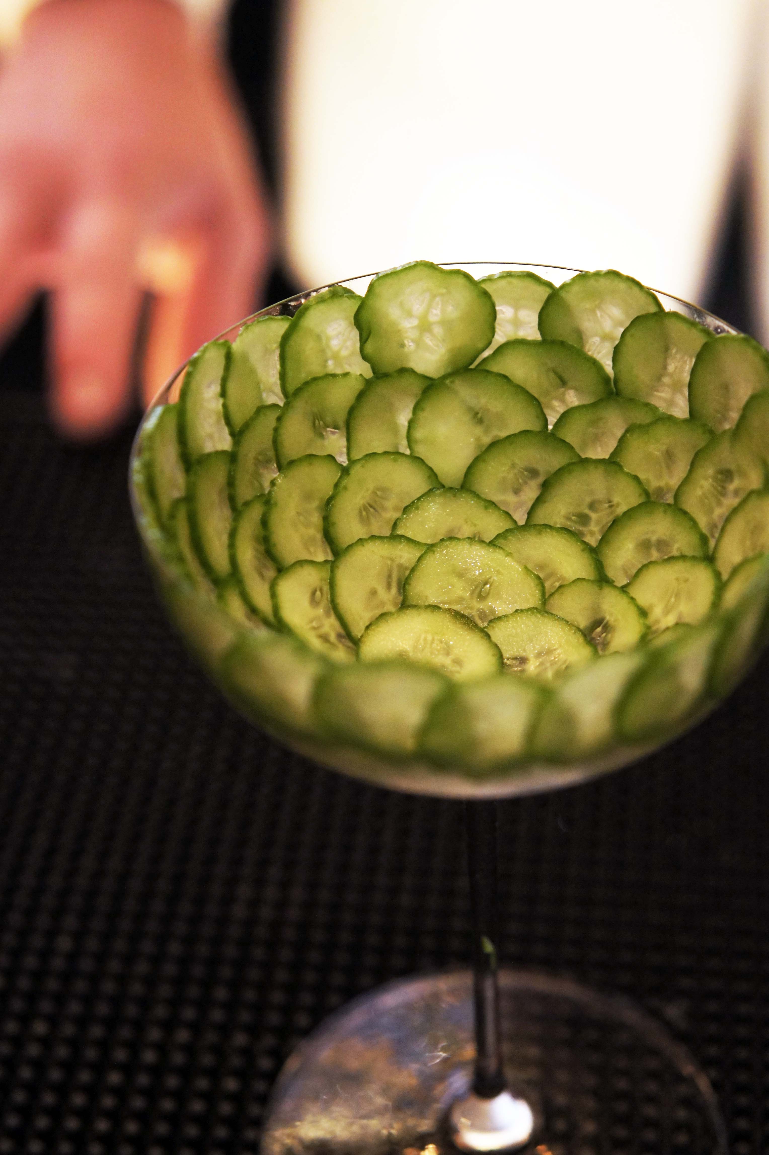 Le génie tient souvent à un détail, et Thomas Waugh, du Pool Lounge à New York, a ce grain de folie que l’on aime voir derrière un bar. Fraichement arrivé au Pool Lounge, bar central du Four Seasons de New York, ce transfuge de l’excellent ZZ’s Clam Bar, a créé une carte de 15 cocktails à la lecture simpliste : un nom (pear, smoke, cinnamon, mint, carrot, …) et pour chacun d’entre eux quatre ingrédients. Parmi eux, le Cucumber marque par sa présentation : dans une majestueuse coupe ornée de concombres, un twist de green beast -concombre, absinthe, citron vert, sirop de canne- très frais.
