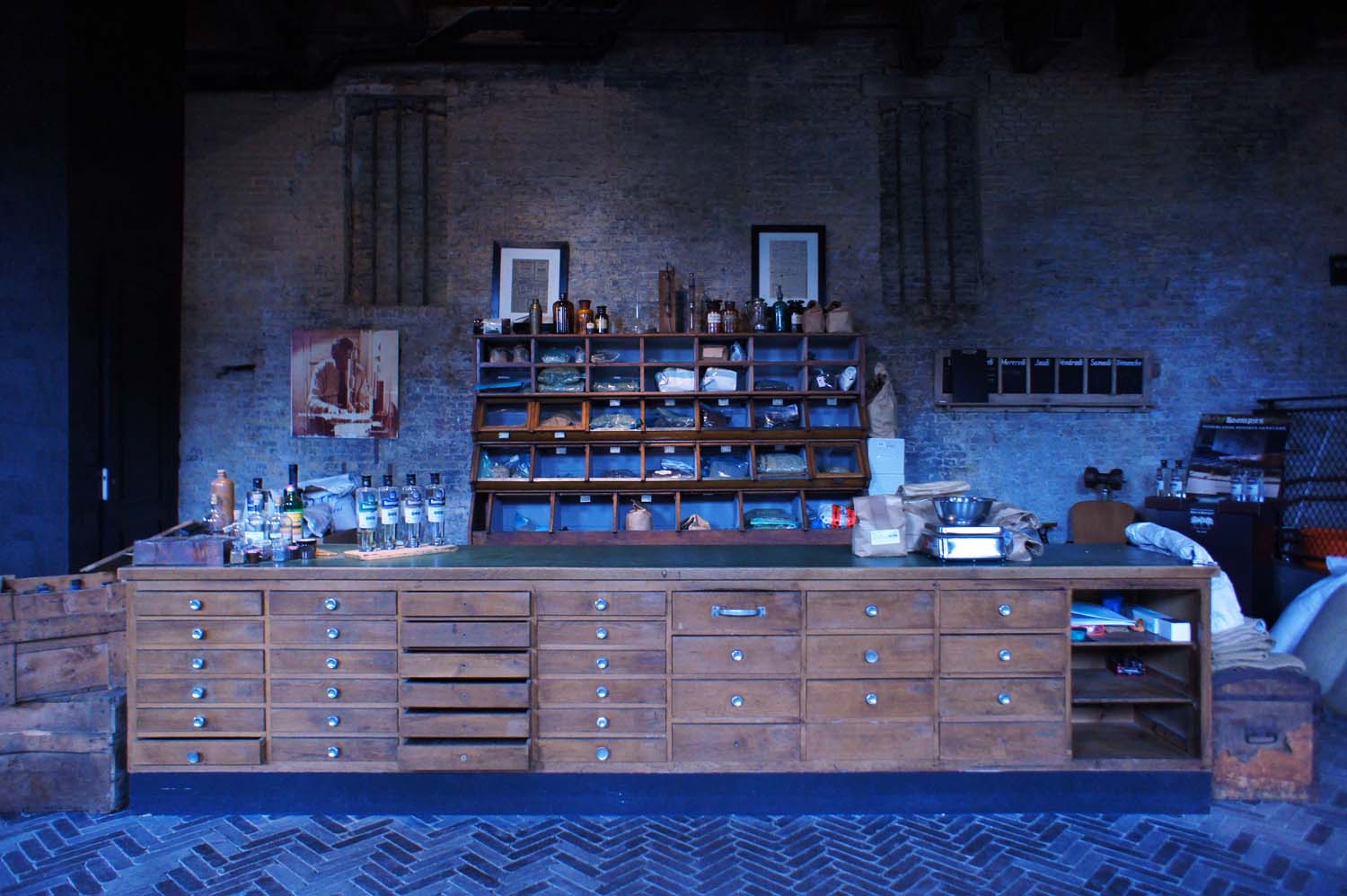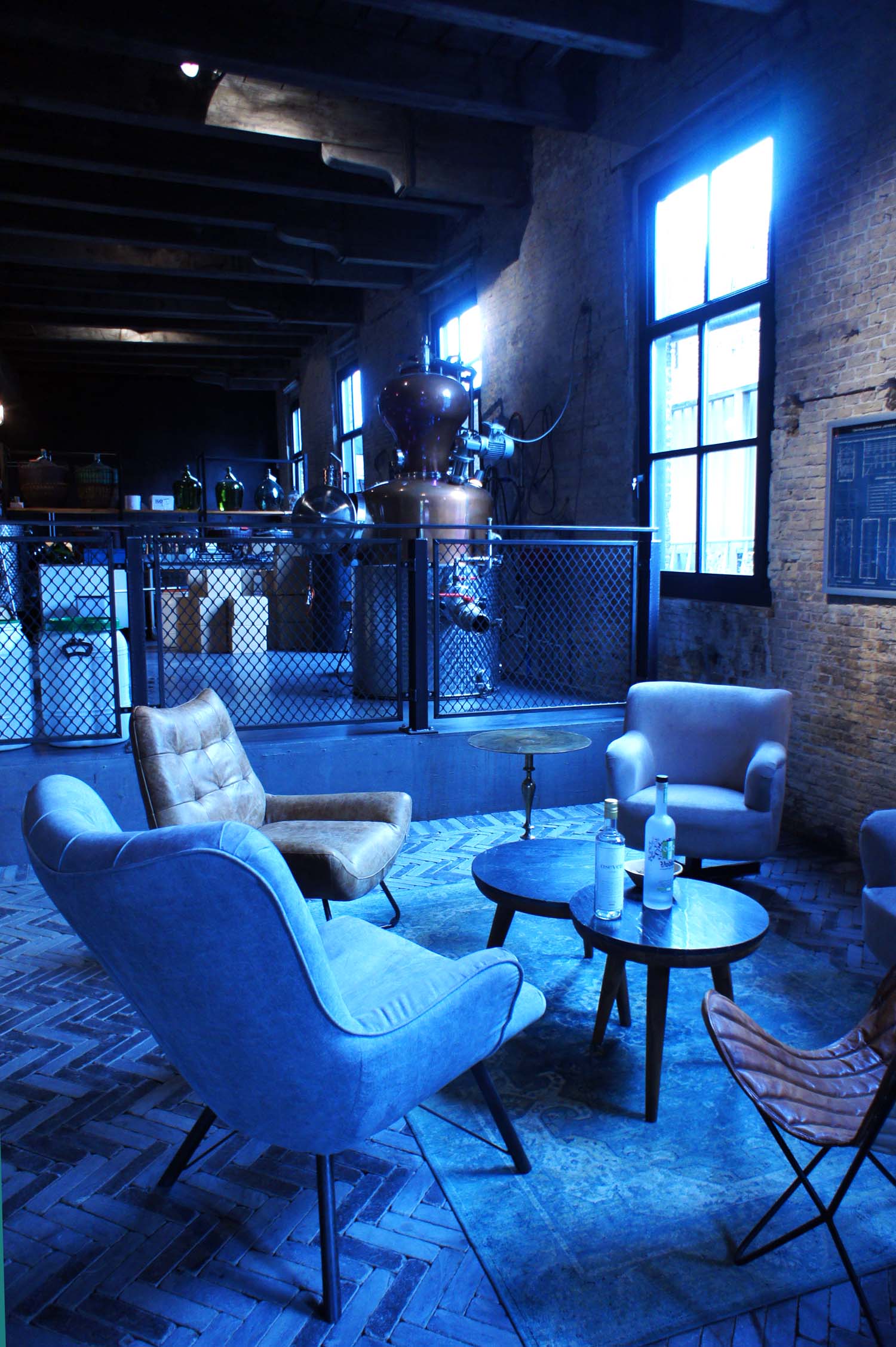L’extérieur du bâtiment qui n’augure rien d’extraordinaire… et pourtant. L’intérieur de la distillerie Onder de Boompjes est partagé en trois parties : une pièce avec un bar central et un comptoir à ingrédients, juste après, en enfilade, la distillerie et ses quatre alambics et enfin le labo où sont développés les tests et les contrôles qualité.