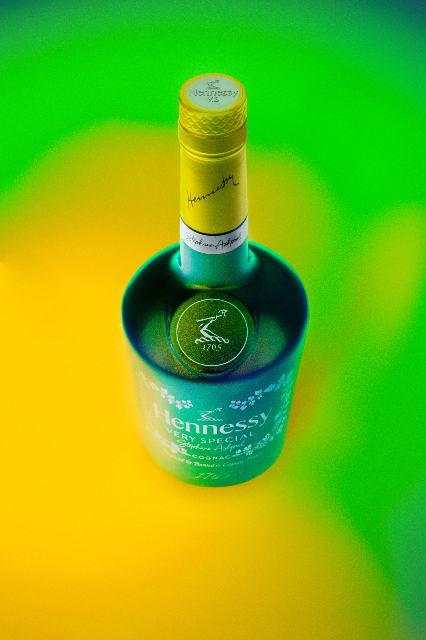 Pour cette édition spéciale, l’artiste a opté pour une approche novatrice en couvrant entièrement la bouteille d’une peinture « caméléon » au dégradé de bleu, de jaune et de vert. Les teintes irisées confèrent à la bouteille une impression de couleurs lumineuses en mouvement, s’accordant parfaitement à tous les décors. Cette réinterprétation unique d’Hennessy Very Special reflète pour Stéphane Ashpool le caractère singulier de l’assemblage de ce cognac, dont les notes chaudes et torréfiées s’harmonisent idéalement avec chaque cocktail.