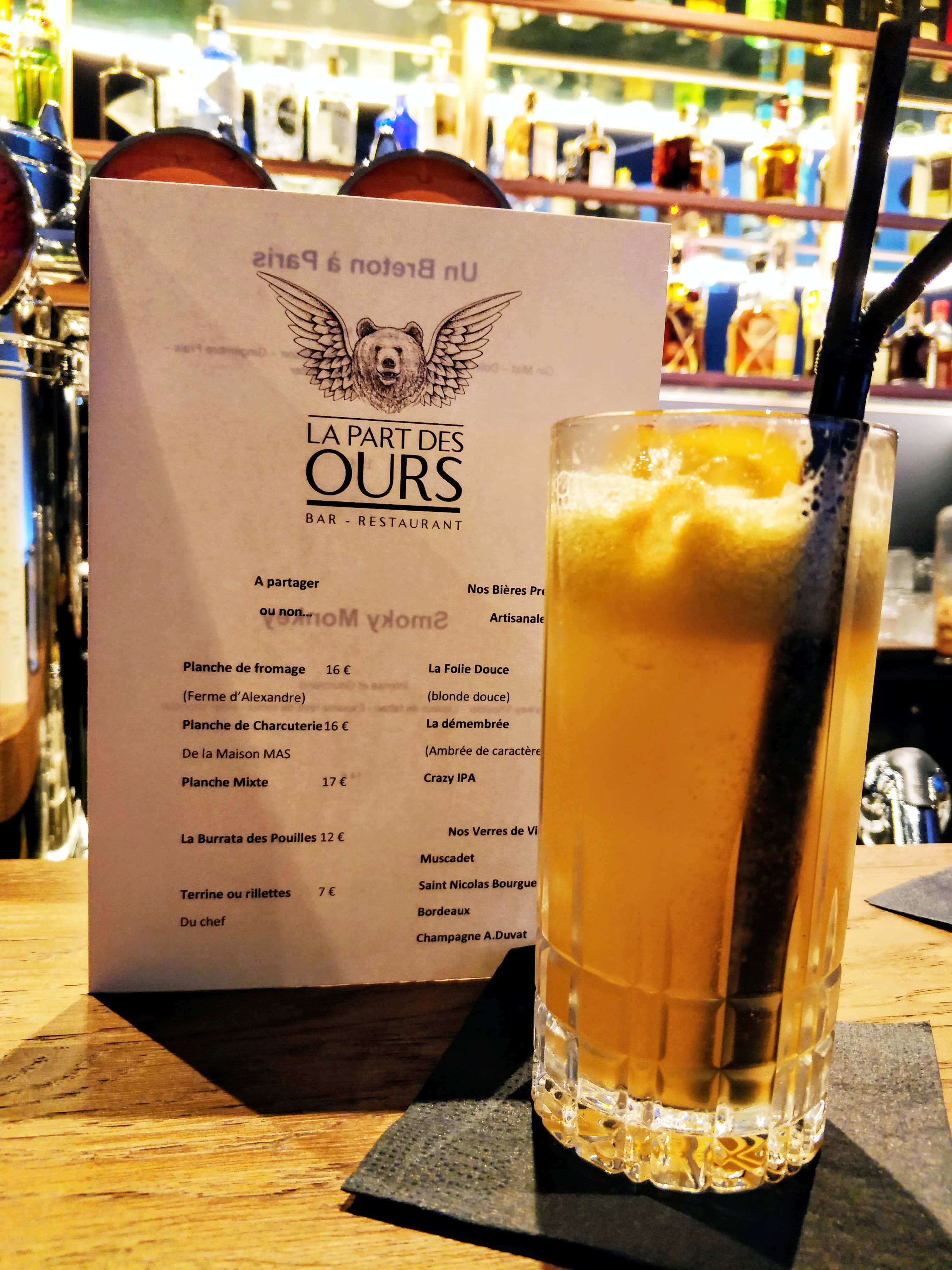 Côté cuisine, la carte est encore en construction également mais l’offre alléchante ravira les impondérables qui comme moi ne conçoivent plus une partie de cocktails en l’air sans une cuisine au diapason. Œuf mollet gratiné et crème d’épinards ; carotte confite jus de coing et chips de jambon, vous voici lancé. Epeautre, potimarron rôti aux épices ; joue de porc et panais ; poulet rôti et mousseline vous voilà comblé. Et pour les gourmands, riz au lait ; crème brulée à la lavande ou moelleux au chocolat, vous voilà repu. Ajoutez à cela quelques vins bien triés sur le volet, la blonde douce, l’ambrée de caractère et leur sœur crazy IPA, des fromages de la maison Alexandre et la charcuterie de la maison Mas et vous obtenez un Ours paré à affronter l’hiver. A découvrir de toute urgence, quelque chose me dit que si vous voulez vous en tailler une bonne part, mieux vaut ne pas attendre que tous les ours de la capitale débarquent, ce qui ne devrait pas tarder !